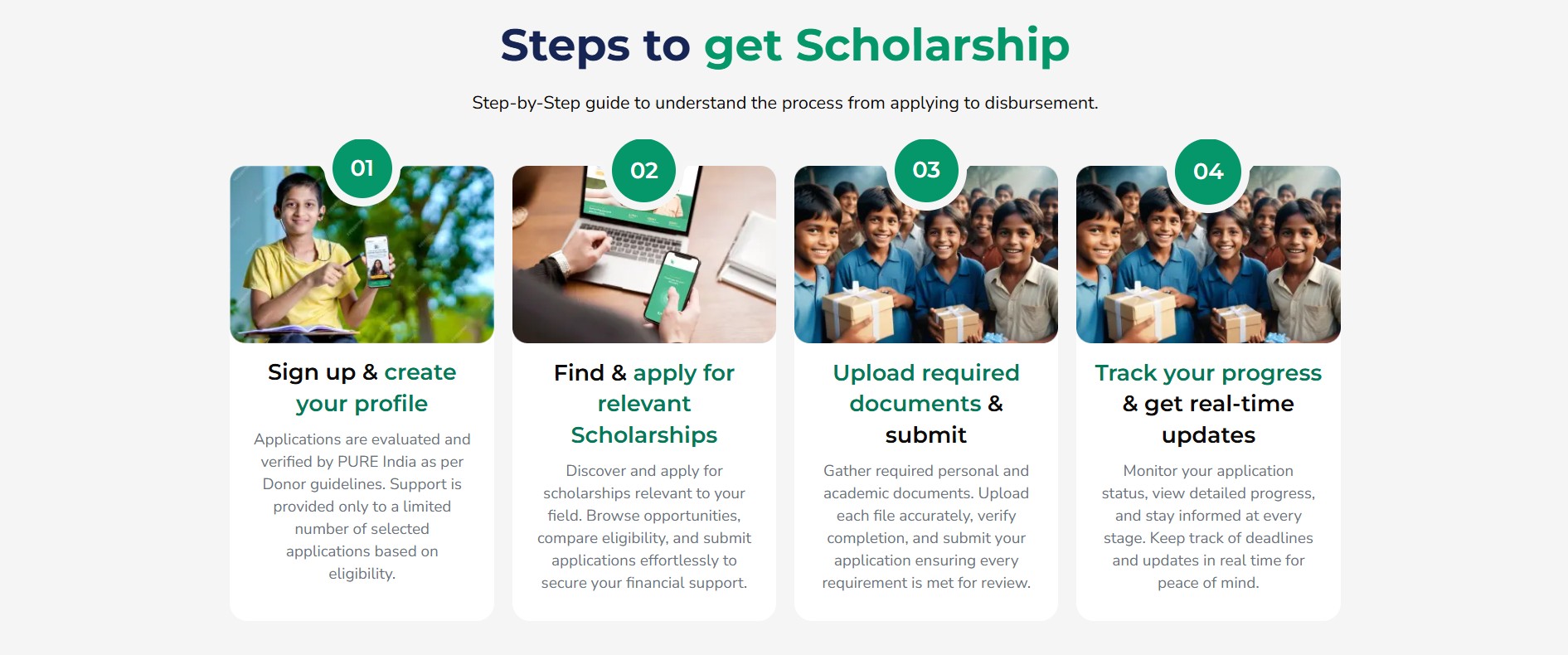 You can reach out to us through our scholarship helpline or email us at scholarships@pureindia.org